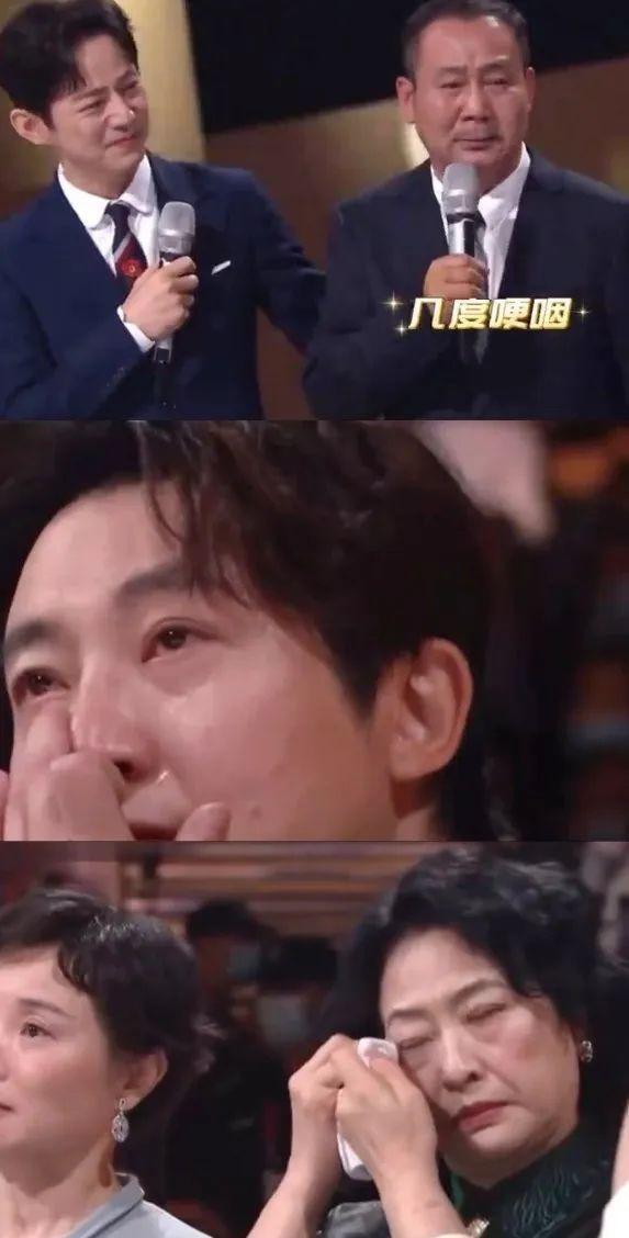 台上何炅感性落泪,台下郭京飞、宋春丽等人热泪盈眶。