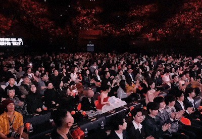 领奖前,主办方用近五分钟的短片将张艺谋作品串在一起,并启用交响乐队现场配乐,一曲作罢全场掌声雷鸣。